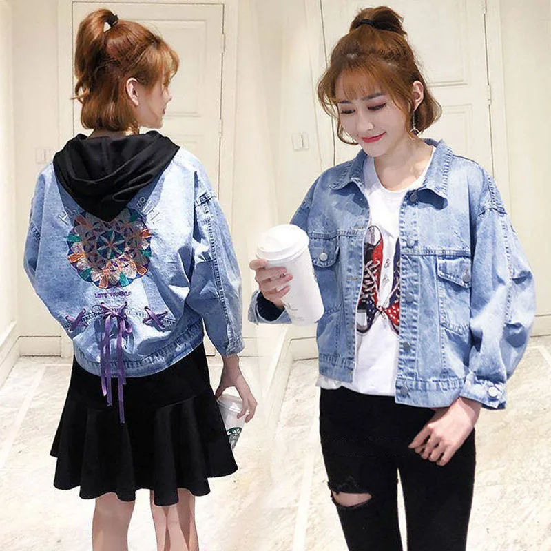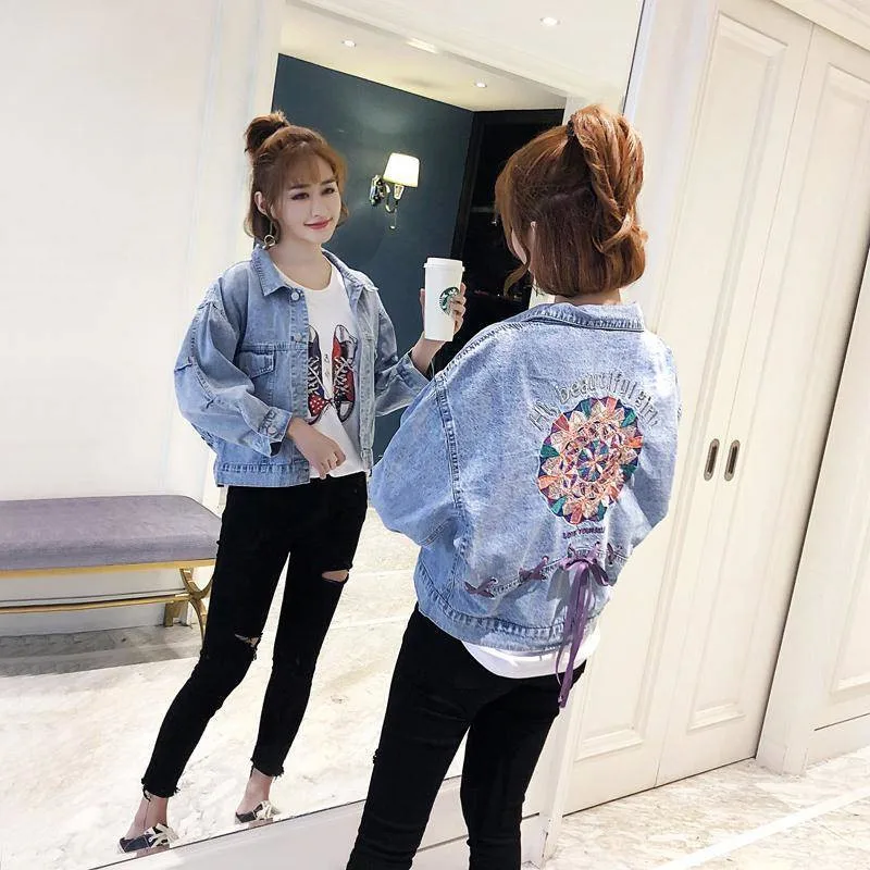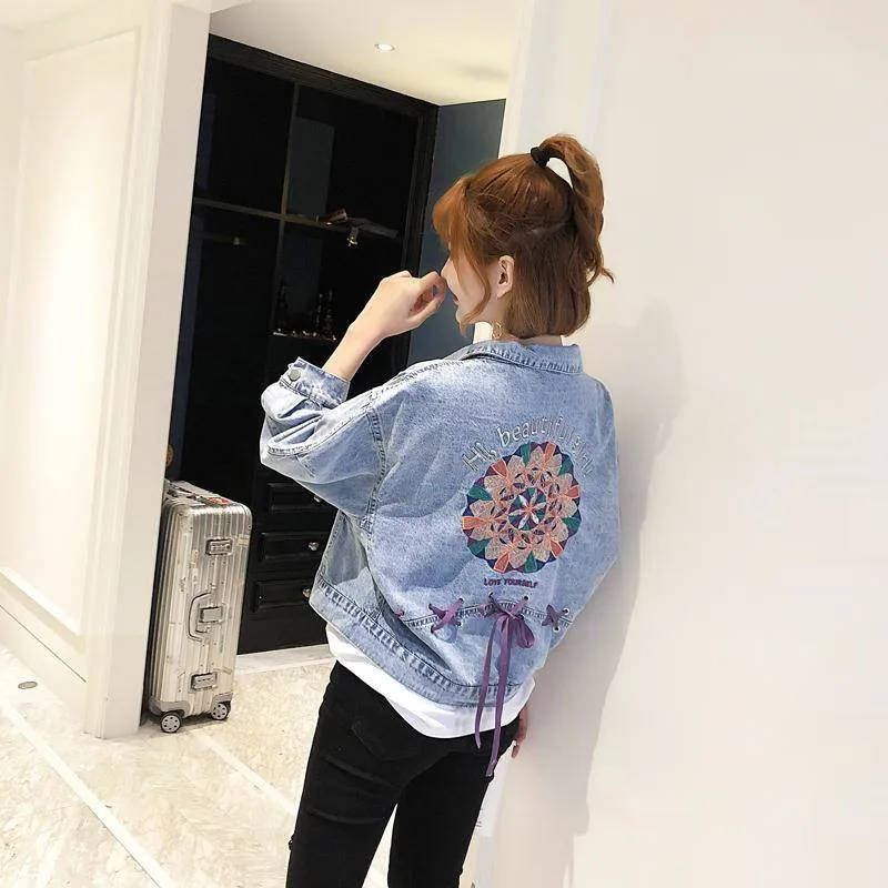 Related Product for [KEYWORD] and Denim Female Jacket Autumn Vintage Ethnic Appliques Embroidery Lace-up Loose Jean Coat Long Sleeve Outerwear Jacket For Women
