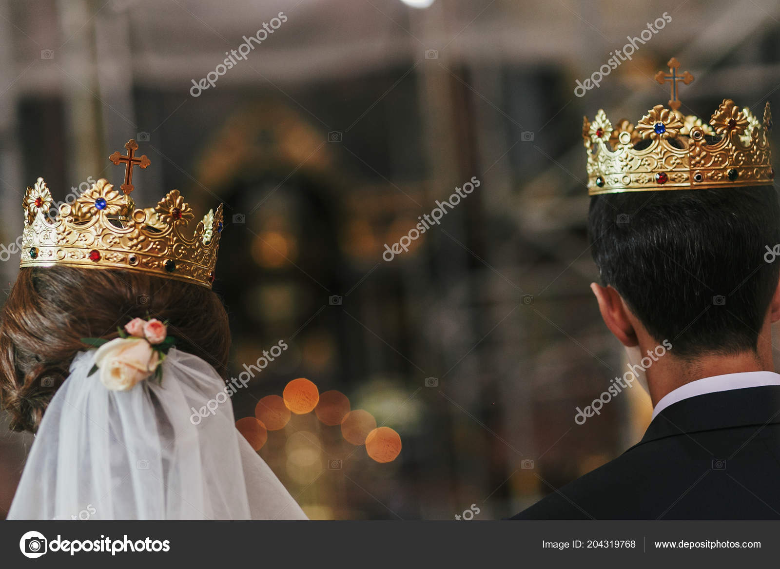 Bride Groom Standing Golden Crowns Cross Holy Altar Wedding Ceremony Stock Photo C Sonyachny 204319768